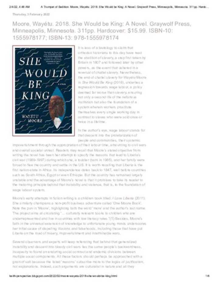 Would Be King 2018 novel by Waytu Moore NYT Crossword Clue Answers are listed below and every time we find a new solution for this clue, we add it on the answers list down below. In cases where two or more answers are displayed, the last one is the most recent.